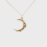 Capture the magic of the night sky with the One-of-a-Kind Crescent Moon Necklace. This enchanting Crescent Moon Necklace is crafted in 14K gold and features a celestial crescent moon adorned with sparkling sapphires in a starburst setting, radiating cosmic elegance. The Crescent Moon Necklace beautifully combines celestial charm with timeless style.