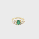 Our Eliana diamond alternative engagement ring is a mesmerizing piece that will take your breath away! This beautiful ring is set in 18k yellow gold and features a pear-shaped emerald as the center stone, weighing 1.2 carats. The emerald's vivid green color is sure to catch the eye and is perfectly complemented by round & pear shaped GH VS1 diamonds, with an approximate total carat weight of 1.05. The diamonds are set in a halo around the emerald, as well as on the band, creating a truly elegant and sophisticated look. It is one of the best diamond alternative engagement rings from our selection. Time to confess your love with this cherished and unique diamond ring.